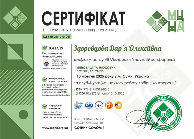 Конференція відбулася 10 жовтня 2025 року у місті Суми, Україна. Наші студентки взяли участь у заході з публікацією своїх наукових робіт у збірці конференції. За участь та публікацію роботи отримали сертифікати.
